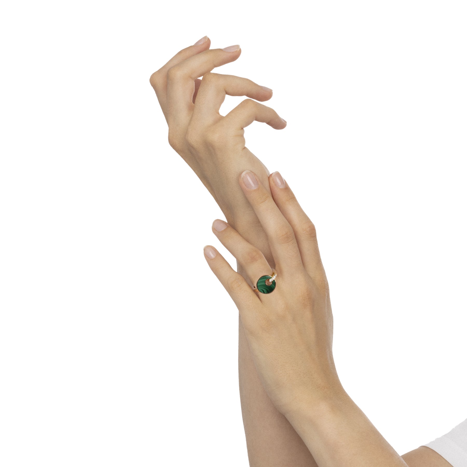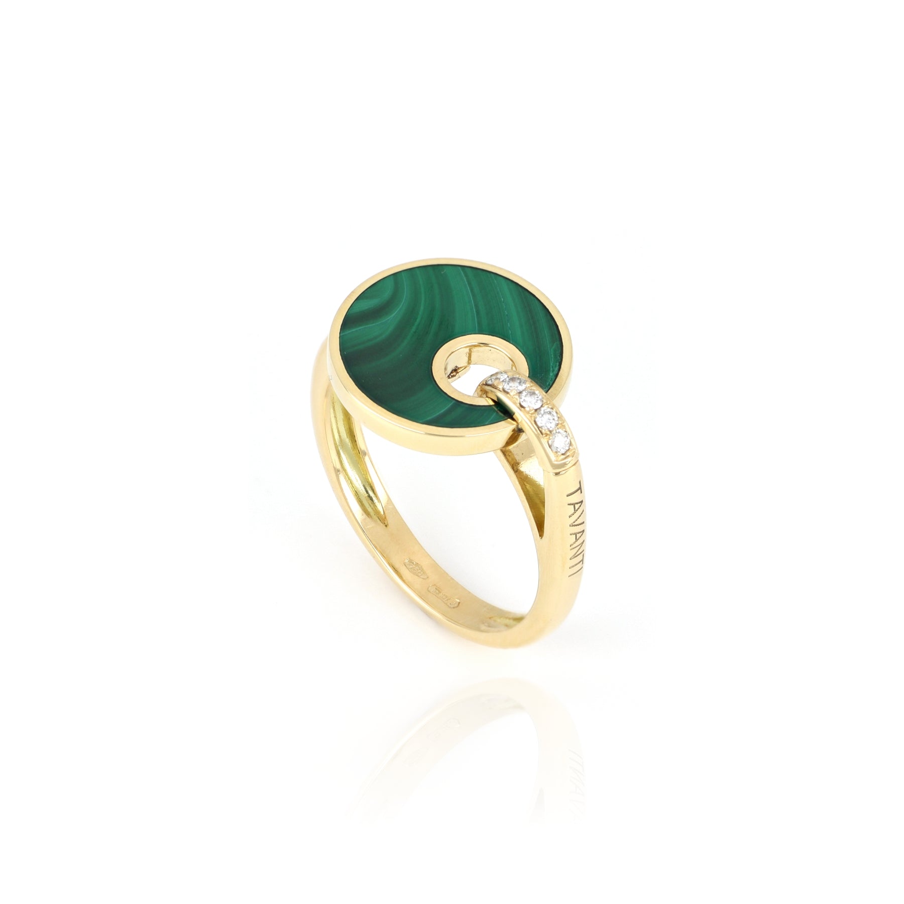 Anello dal design innovativo e divertente, dove un tocco di irriverente creatività lega l’oro 18 kt con un elemento circolare con malachite. Gioiello impreziosito da pavé  di diamanti, ideato interamente nel nostro atelier nel cuore della Toscana.
