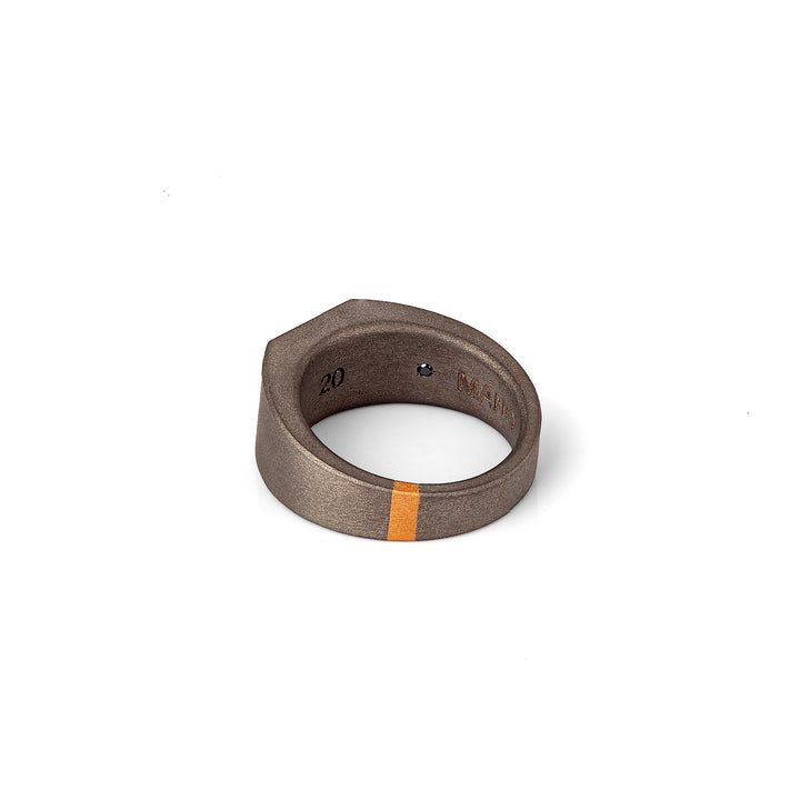 Prezioso anello costituito da un pavè di 25 diamanti black per una caratura totale di 25 punti. All’interno del gambo il diamante black da 1 punto simbolo e caratteristica distintiva del marchio MANO|J. Ad impreziosire l’intero gioiello, si trova lungo lo sviluppo del gambo, un riporto in oro rosso 18 kt . La leggerezza del titanio dona a questo modello massimo comfort e indossabilità.
