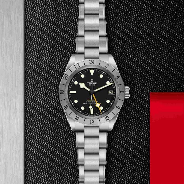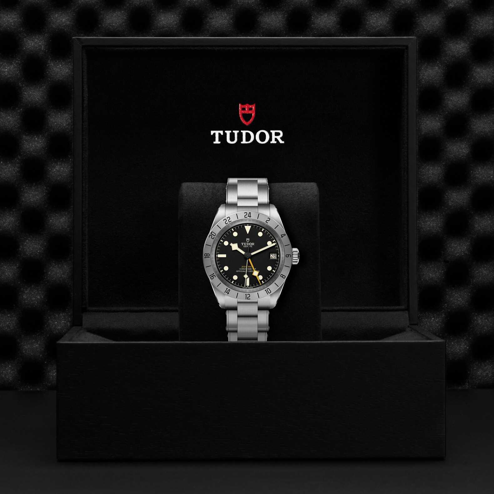 Il Black Bay Pro è un modello interamente nuovo dotato di doppio fuso orario, una complicazione tecnica che permette di visualizzare l’ora locale senza perdere di vista l’ora di un altro fuso orario. Compatto, robusto e sportivo, questo modello presenta numerosi dettagli estetici unici e celebra lo spirito degli orologi tecnici che TUDOR ha prodotto per i professionisti nel corso della sua storia. Riconoscibile grazie alla lunetta fissa satinata graduata 24 ore e alla lancetta “Snowflake” 24 ore di colore giallo, il Black Bay Pro è animato dal Calibro di Manifattura TUDOR MT5652 con funzione GMT integrata.