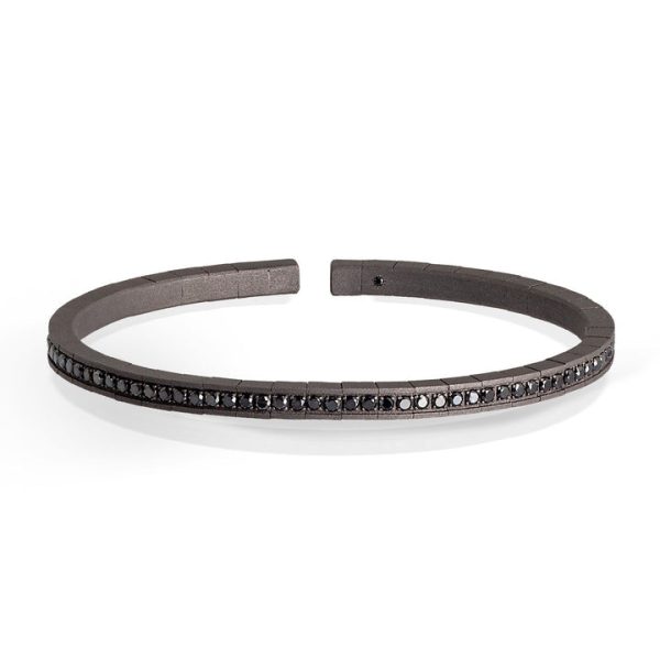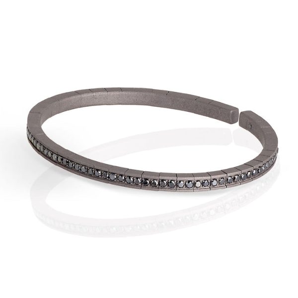 Bracciale a struttura elastica caratterizzato da una lunga serie di 99 brillanti black per una caratura totale di 99 punti che percorrono parte dell’intero bracciale. All’interno, a garanzia del marchio MANO|J., è stato incastonato un diamante nero da 1 punto. Bracciale raffinato, elegante e perfettamente indossabile.