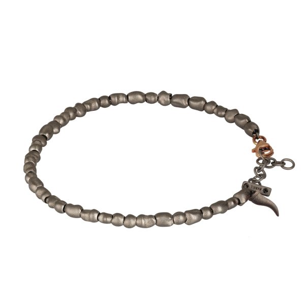 Un gioiello originale che racchiude in sè una personalità decisa adattandosi allo stesso tempo ad ogni occasione. Una fila di sassi in titanio scorrono attraverso una robusta catena interna dello stesso materiale, terminando con una preziosa chiusura con moschettone in oro rosso ed un piccolo cornetto pendente.Il testimonial del marchio MANO|J., il brillante black da un punto, è incastonato sopra la targhetta in titanio pendendo alla chiusura.