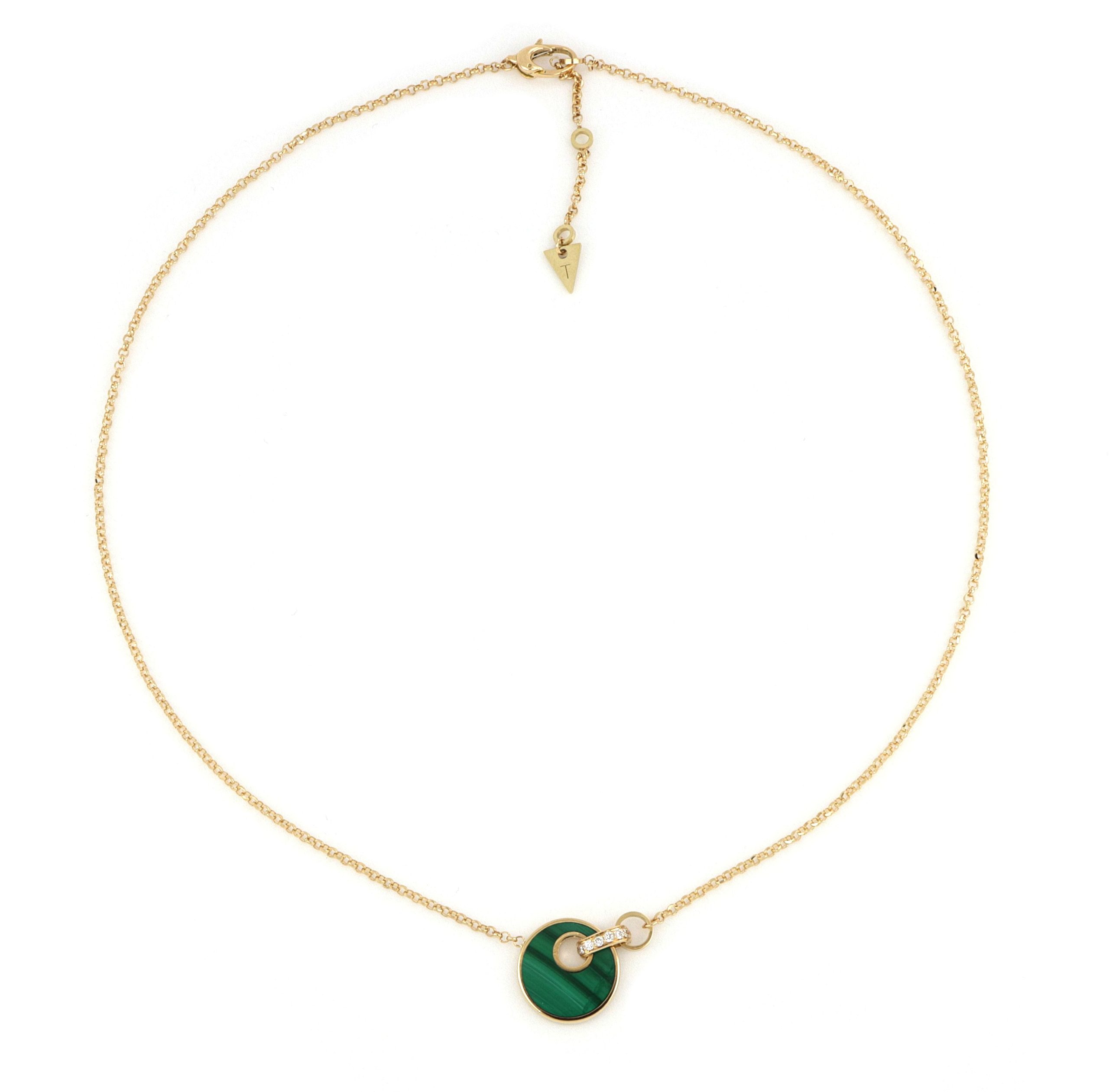 Questa collana in oro giallo è un gioiello dal design innovativo e divertente. Un tocco di irriverente creatività unisce l’oro 18 kt con un pendente in malachite, impreziosito da un pavè di diamanti.