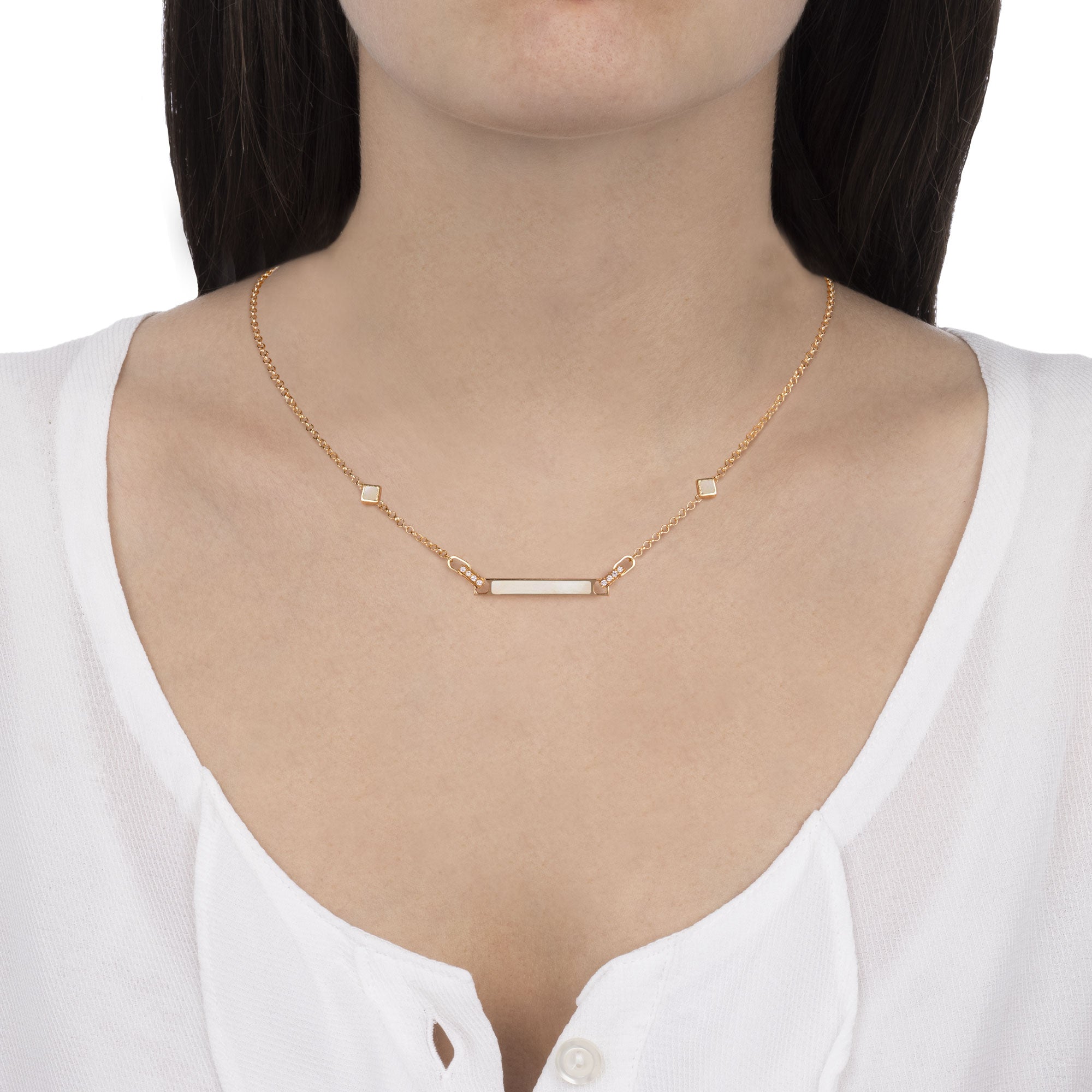 Il calore dell’oro e la luminosità delle pietre naturali , un elegante gioco di forme e colori che danno vita a questa collana in oro giallo 18 kt caratterizzata da un elemento centrale reso unico dal colore delicato della madreperla bianca e dalla brillantezza dei diamanti. Un gioiello dal design lineare e curato nei minimi dettagli indossabile in ogni occasione.