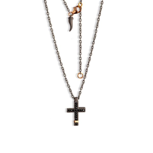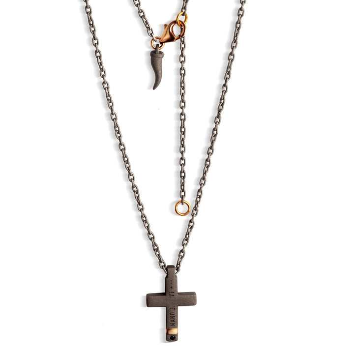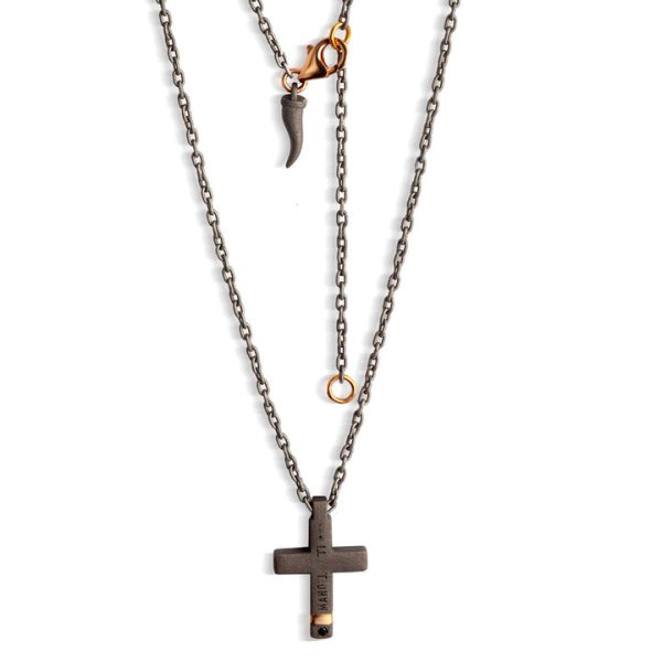 Accanto al titanio, in questa croce si trova come elemento di preziosita’, un riporto in oro rosso 18 kt. 10 diamanti black, pari ad una caratura di 10 punti, rivestono l’intera superficie del ciondolo, lasciando in evidenza l’inserto in oro rosso 18 kt. La catena passante è arricchita da due anellini e una chiususra a gancio in oro rosso 9 kt . A garanzia del marchio MANO|J., troviamo il diamante black da 1 punto incastonato sul retro della croce.