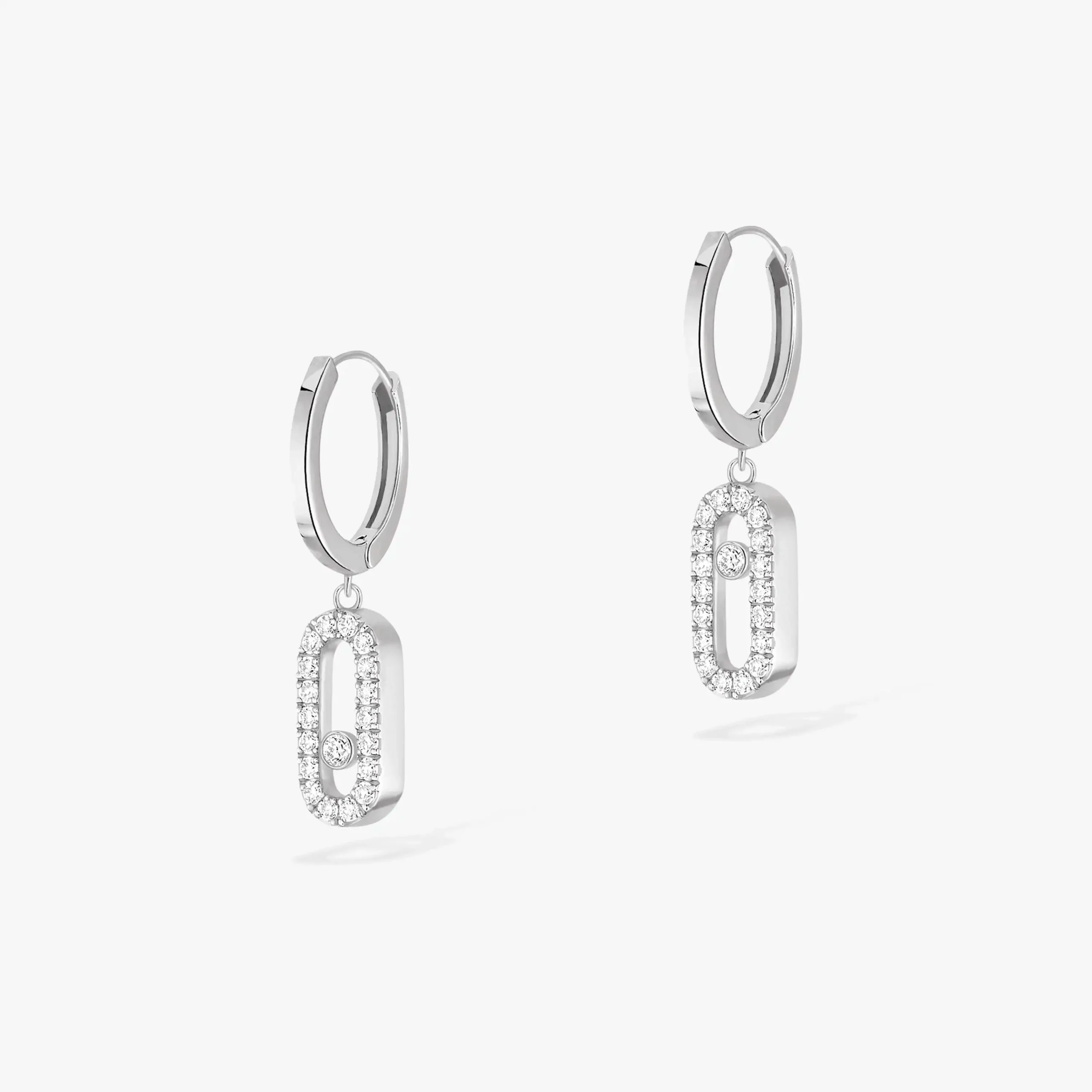 Cerchi un paio di orecchini lussuosi e femminili da indossare tutti i giorni? Scopri i nuovi orecchini a cerchio con diamanti Move Uno. Questi orecchini pendenti realizzati a mano in oro bianco 18 carati sono tempestati di diamanti e presentano il motivo iconico di Messika: un diamante intrappolato tra due binari, che si muove mentre ti muovi. Risultato: orecchini a cerchio dal design delicato, estremamente confortevoli. Da indossare in coppia, da accumulare sullo stesso lobo o anche da soli in mono. Tante possibilità per variare gli stili.