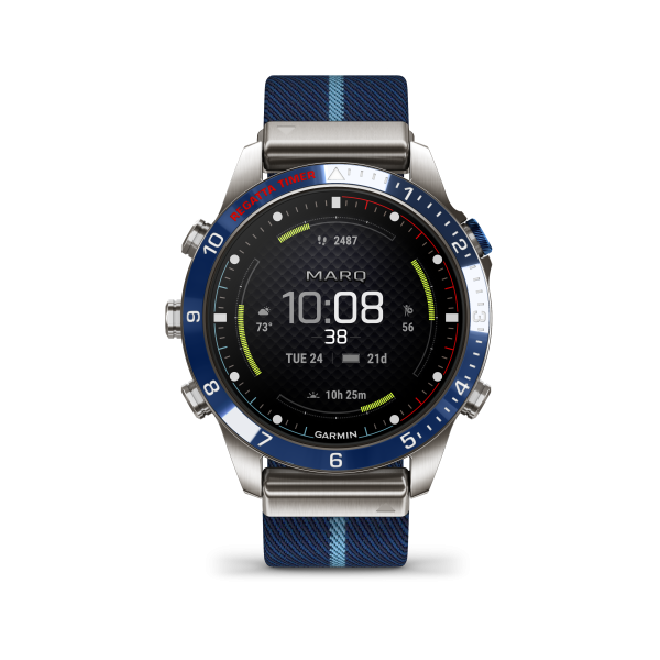Design unico questo elegante e moderno tool watch è dotato di un cinturino in nylon a motivi jacquard a righe ispirato al mondo della nautica e di uno straordinario schermo touchscreen AMOLED con comandi a pulsante tradizionali. La cassa da 46 mm è realizzata in titanio di grado 5 per un design ultraresistente. Durata della batteria prestazioni mai viste grazie a una batteria al litio ricaricabile che dura fino a 16 giorni.