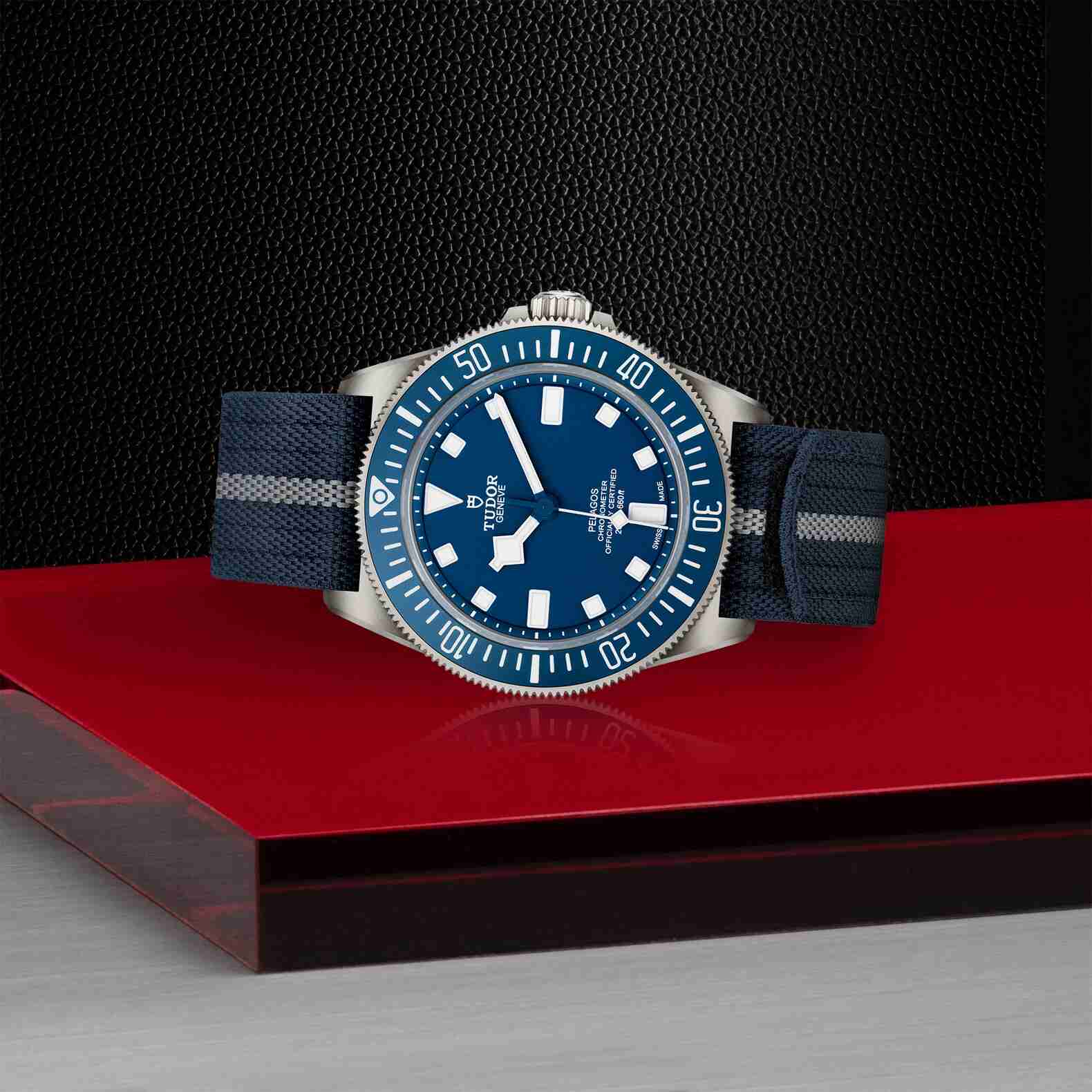 Il modello Pelagos FXD, dove la contrazione dell’inglese “fixed” allude alle robuste barrette fisse per l’attacco del cinturino, è stato sviluppato con la cooperazione dell’unità dei nuotatori da combattimento della Marina militare francese. Impermeabile fino a 200 m, è progettato per la navigazione sottomarina ed è ottimizzato per l’utilizzo professionale. La gamma comprende inoltre un modello che rende omaggio a decenni di orologi TUDOR al polso dei subacquei della US Navy. Completo di barrette di attacco del cinturino fisse, cassa in titanio, Calibro di Manifattura ad alte